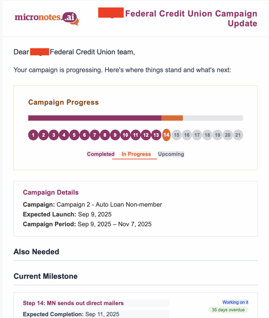 - Huddle (45–60 min): CLO, CMO, Compliance, Risk/CRO, IT/Data, and Campaign Ops meet once, live. Review the top of the backlog: Did last week’s slices ship? What’s blocking the next two? No status theater; demo the actual deliverable (selection file generated, creatives FCRA-checked, Experian file returned, comms in the queue). Micronotes enable this process through a weekly campaign update email as shown below in figure 1.